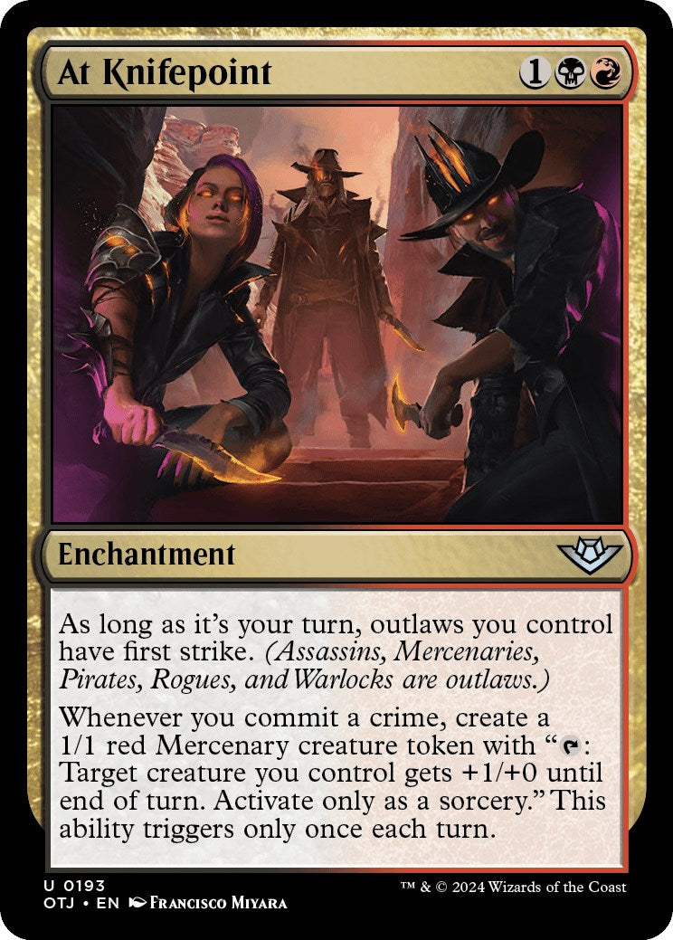 Rules Text Contains: As long as it's your turn, outlaws you control have first strike. (Assassins, Mercenaries, Pirates, Rogues, and Warlocks are outlaws.)