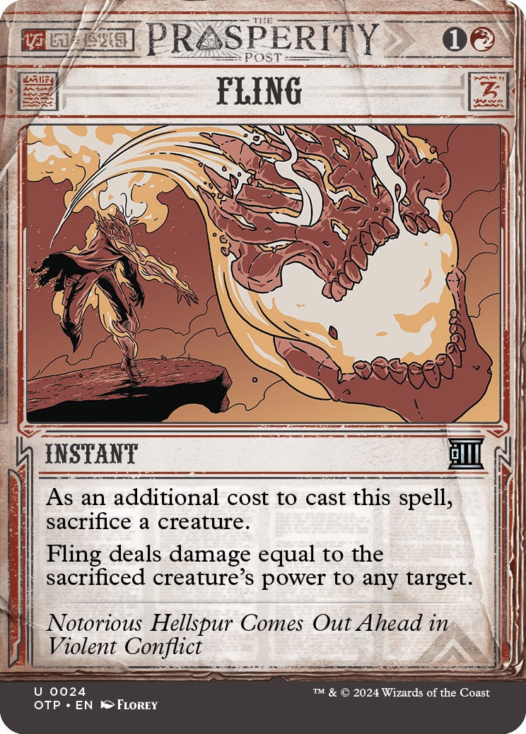 Fling deals damage equal to the sacrificed creature's power to any target. - Flavor: Notorious Hellspur Comes Out Ahead in Violent Conflict