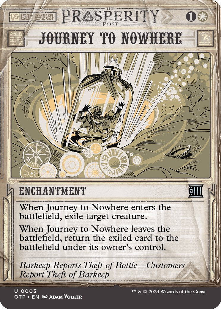 When Journey to Nowhere leaves the battlefield, return the exiled card to the battlefield under its owner's control. - Flavor: Barkeep Reports Theft of Bottle—Customers Report Theft of Barkeep
