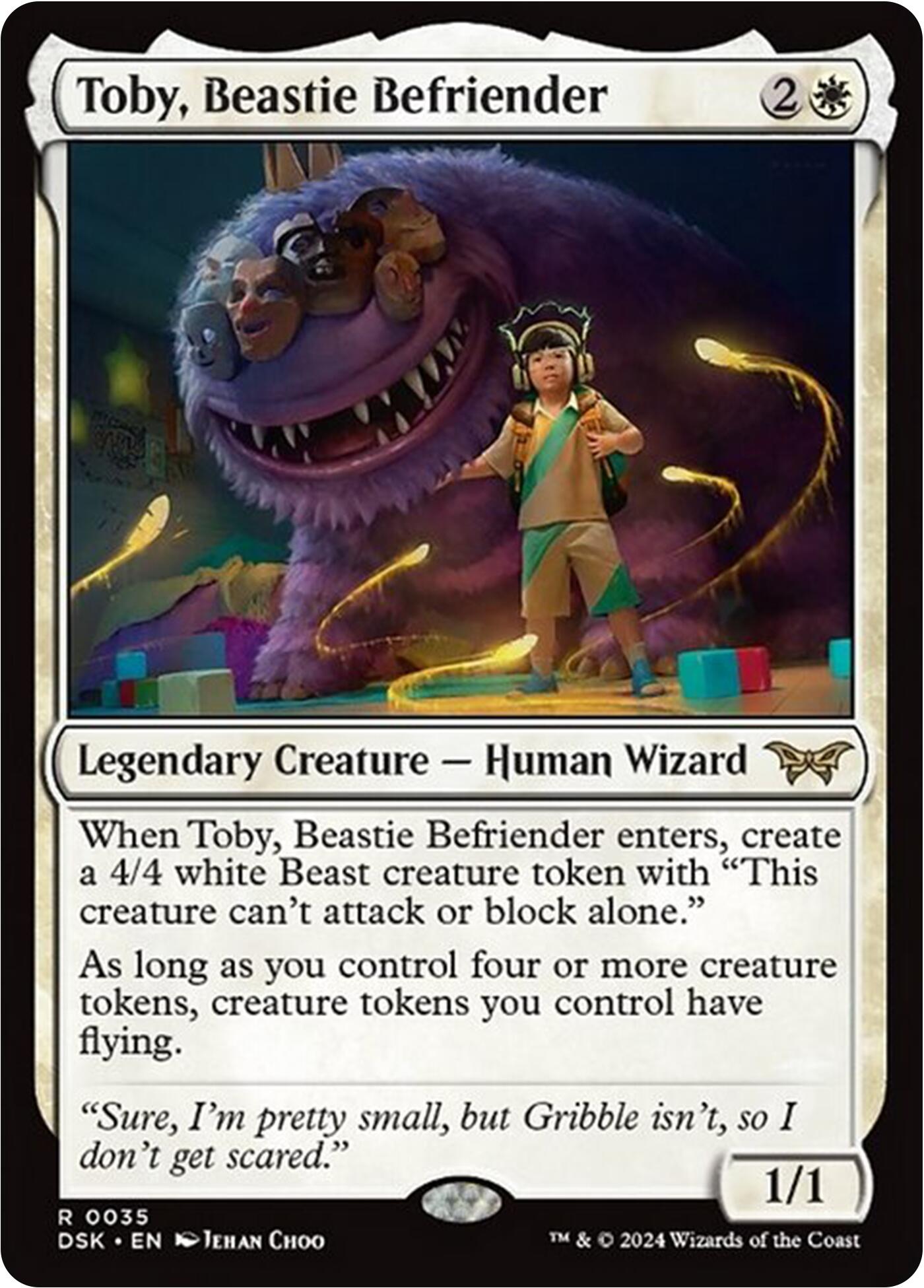 - Rules Text Contains: When Toby, Beastie Befriender enters, create a 4/4 white Beast creature token with "This creature can't attack or block alone."<br> As long as you control four or more creature tokens, creature tokens you control have flying.