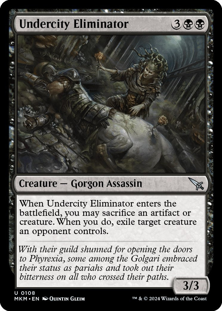 - Rules Text Contains: When Undercity Eliminator enters the battlefield, you may sacrifice an artifact or creature. When you do, exile target creature an opponent controls.